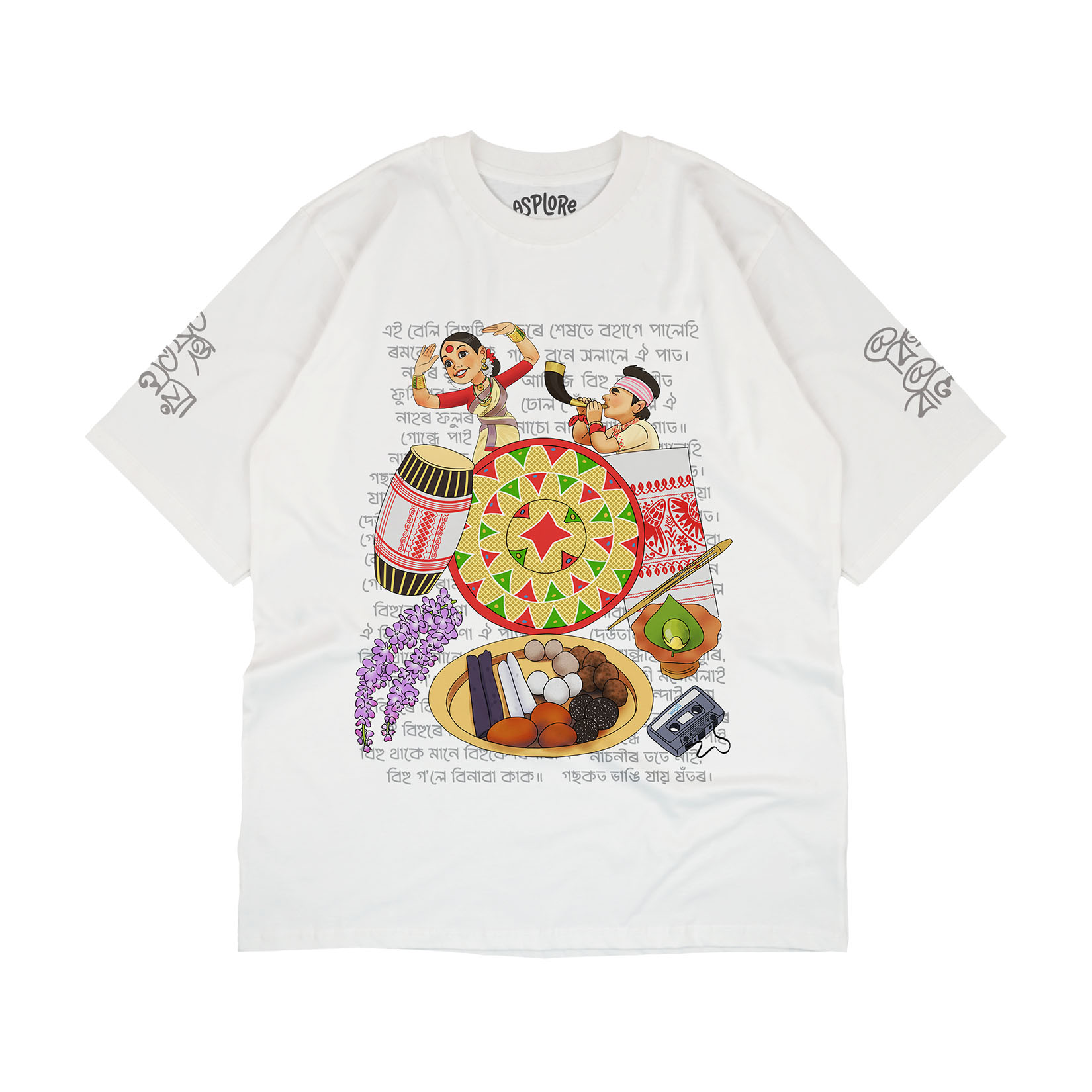 + Free ShippingIndulge in the fervor of Bihu with our captivating streetstyle t-shirt. “Bihu Boliya” (বিহু বলিয়া) whispers on the sleeves, a testament to the festival’s allure. Adorning the front, a medley of Assamese treasures: Nasoni (নাচনী), Pepua (পেঁপুৱা), Jaapi (জাপি), Dhol (ঢোল), Gamusa (গামোচা), Gogona (গগণা), Tamul Paan Aru Bota (তামোল-পাণ আৰু বটা), Kopou Phool (কপৌ ফুল), Pitha (পিঠা) etc., set against a backdrop of lyrical Bihu songs. Each detail captures the vibrancy of Assamese culture, weaving tradition and style into a garment that radiates heritage and passion. It’s a celebration, a tribute to the soul-stirring beauty of Bihu.