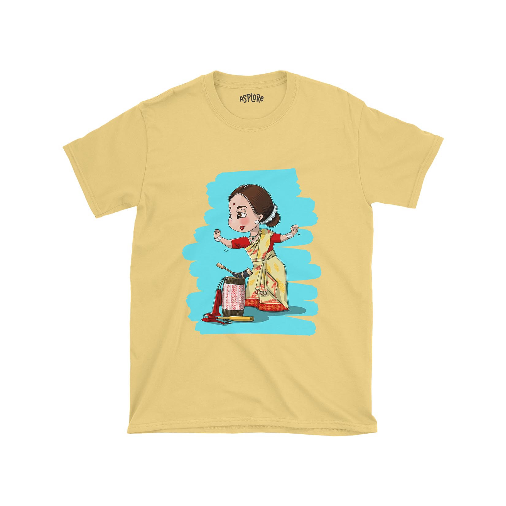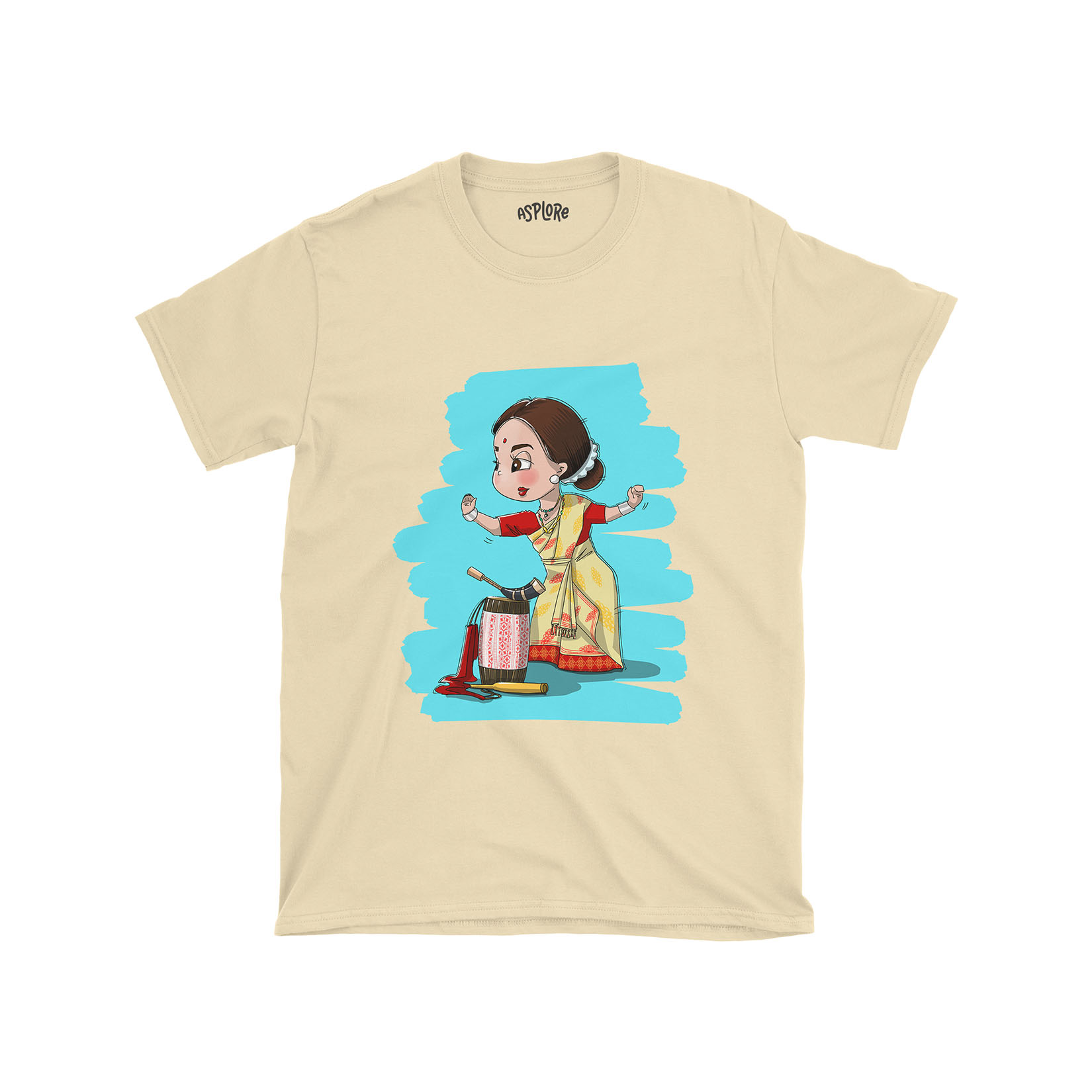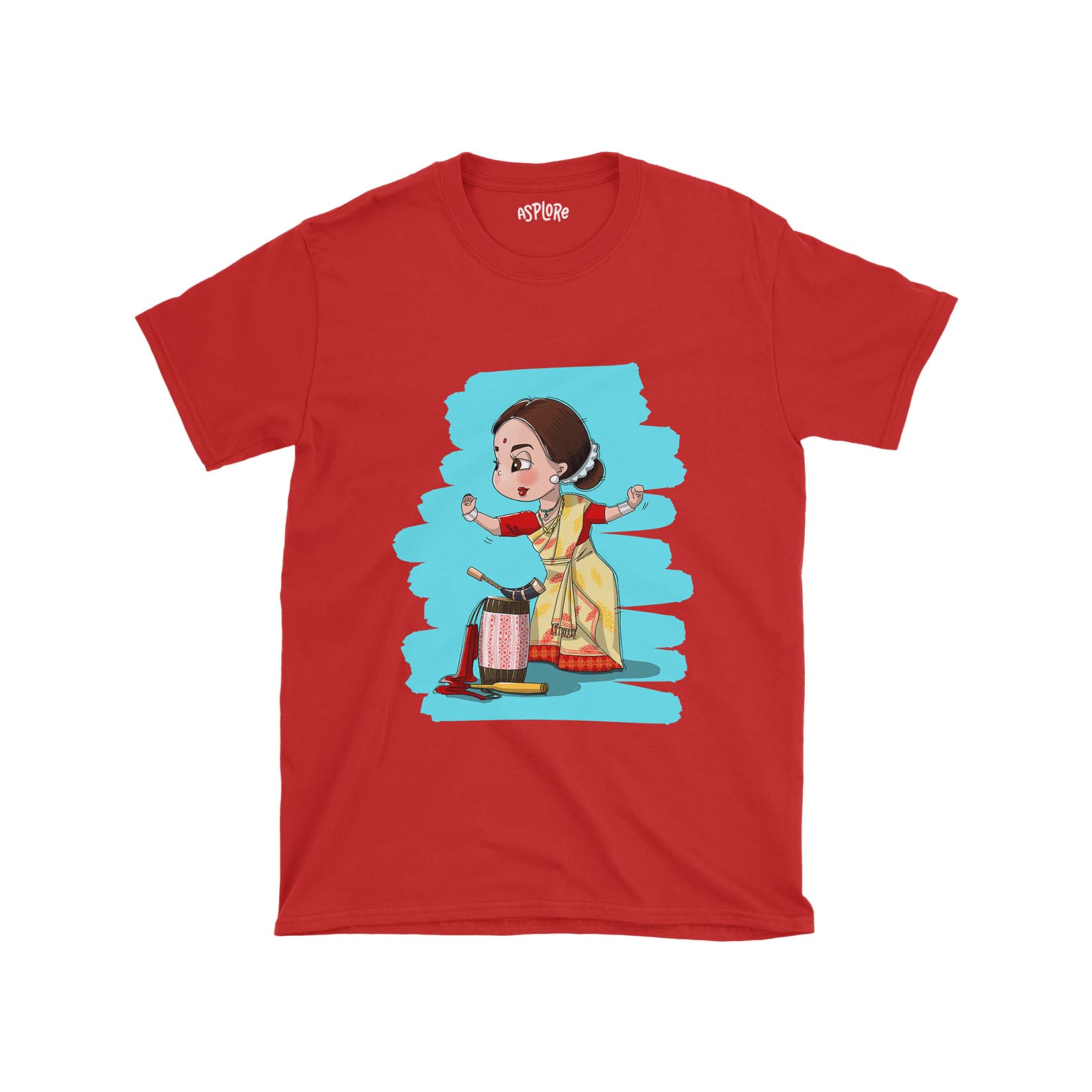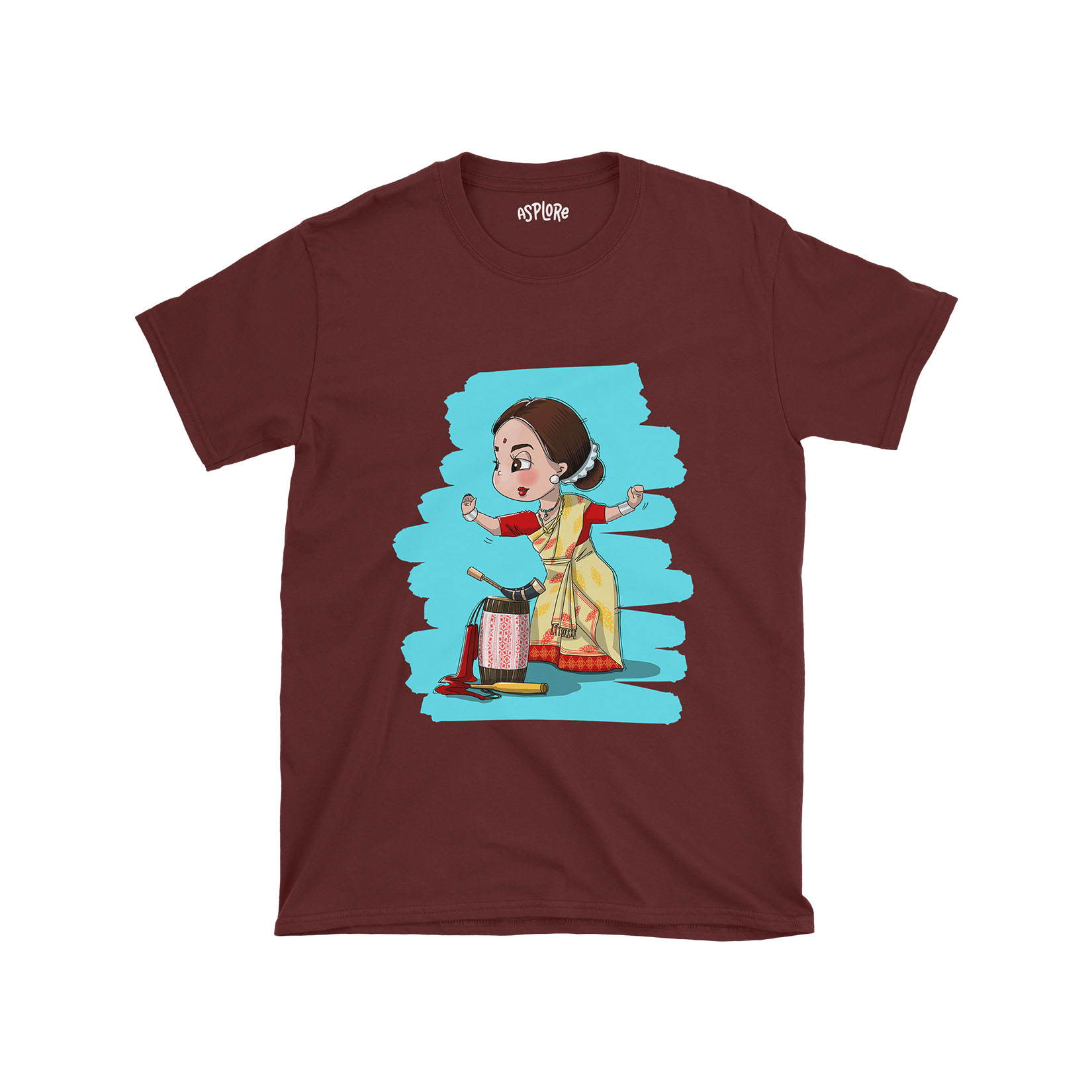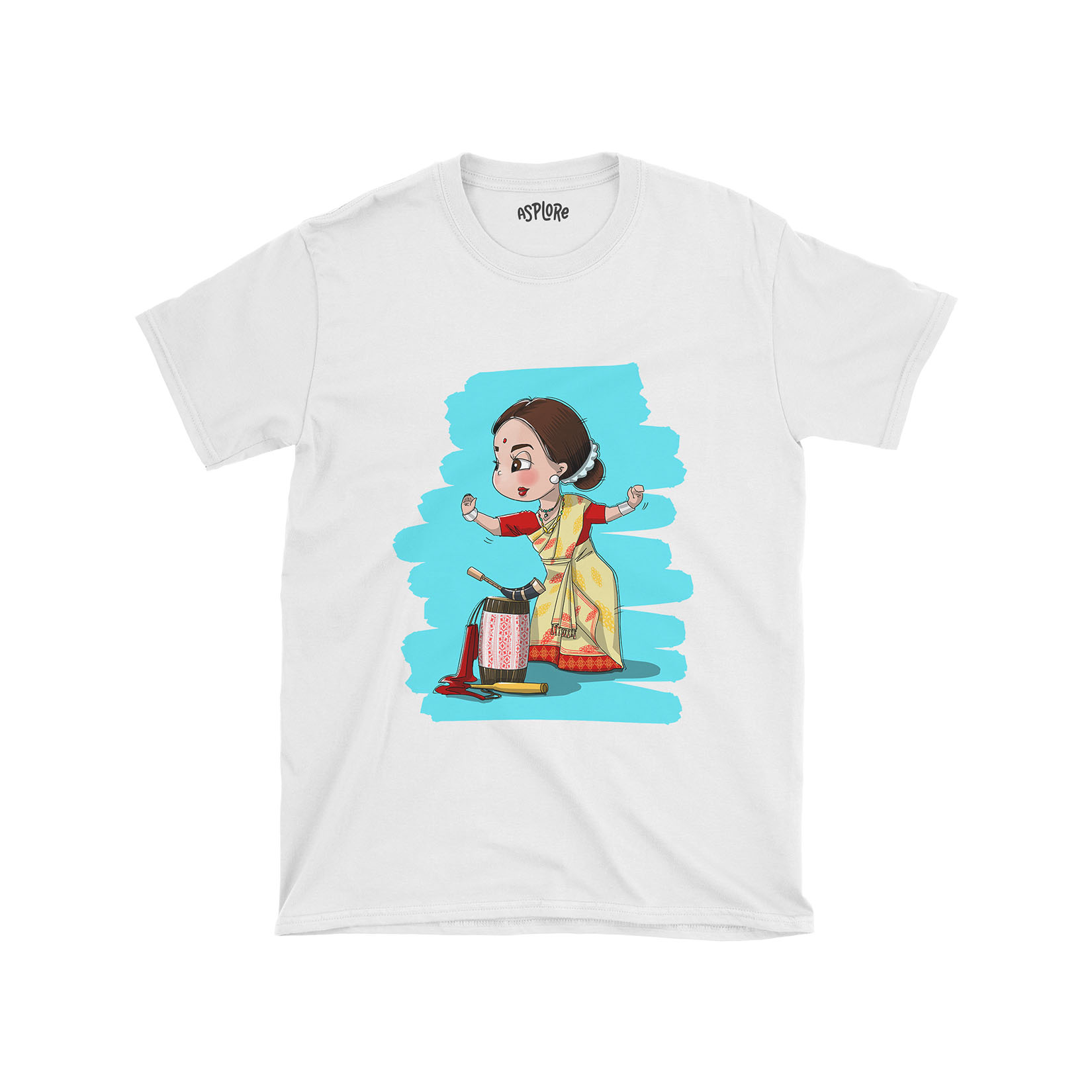 Showcasing a delightful cartoon-style Bihu nasoni in her graceful dance pose, accompanied by the iconic instruments—dhol, pepa, and toka—laying beside her, this illustration is a heartwarming tribute to the mesmerizing nasonis who, with their elegance and allure, have become the epicenter of Bihu dance performances. Drape yourself in this shirt and step into the dance of celebration, tradition, and heartwarming joy.