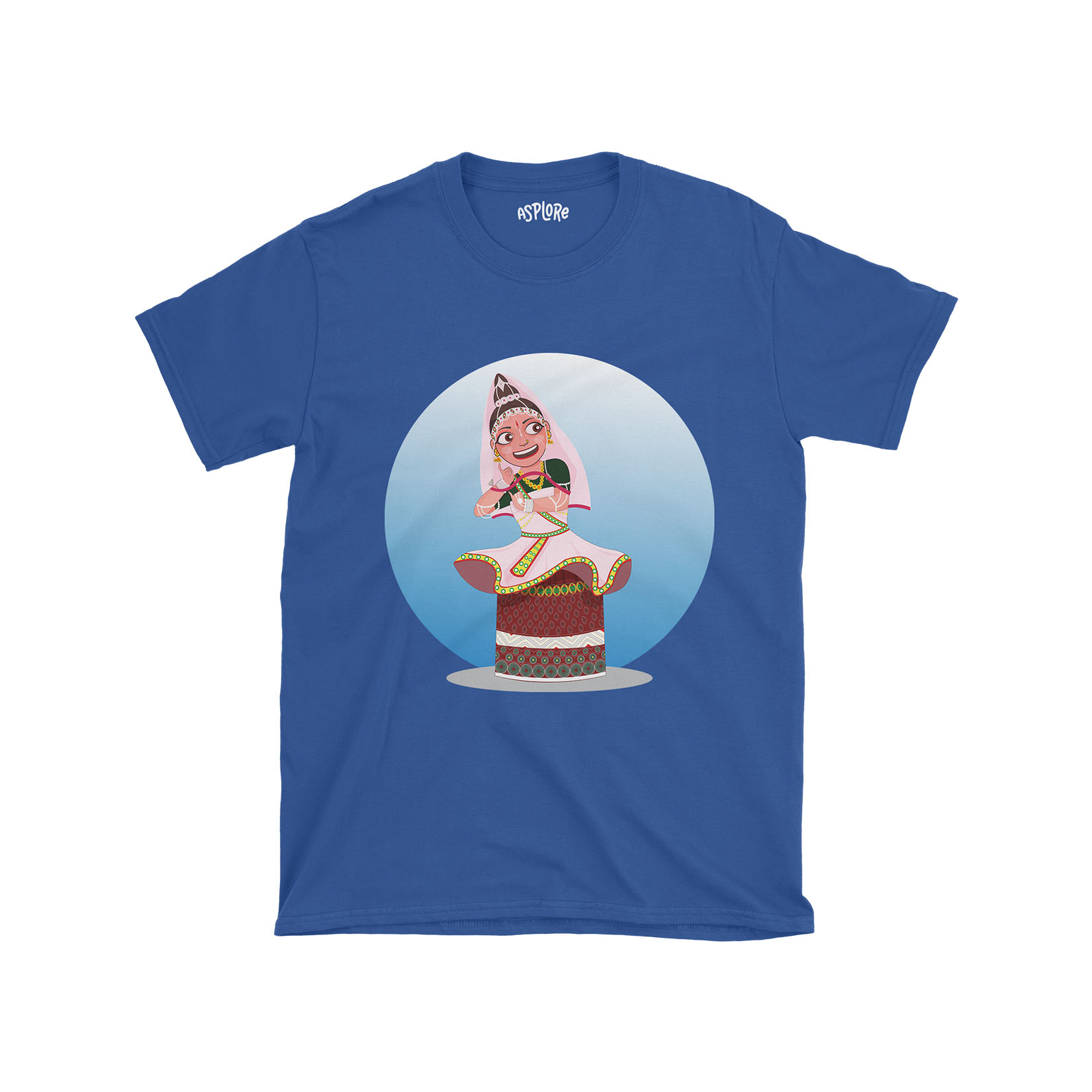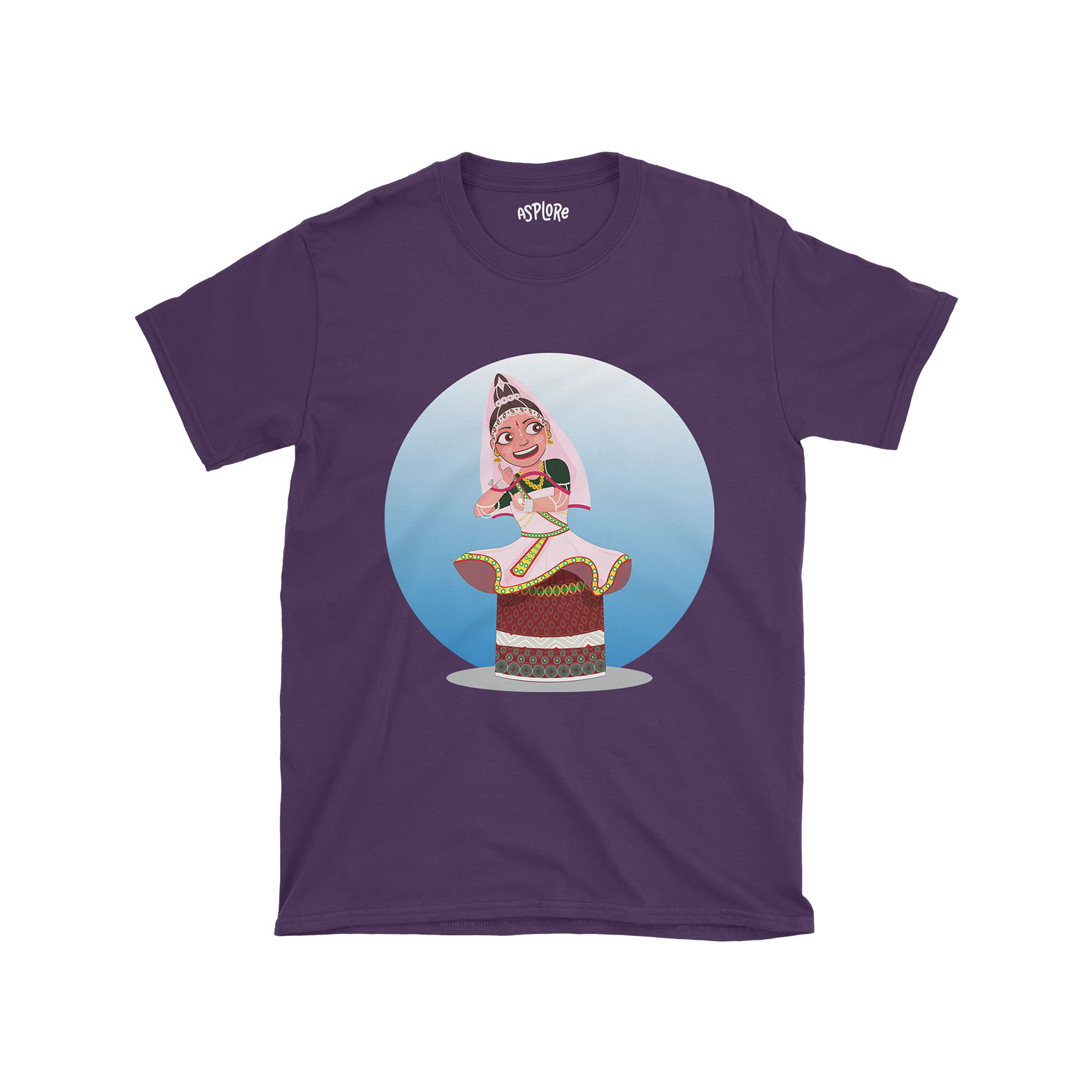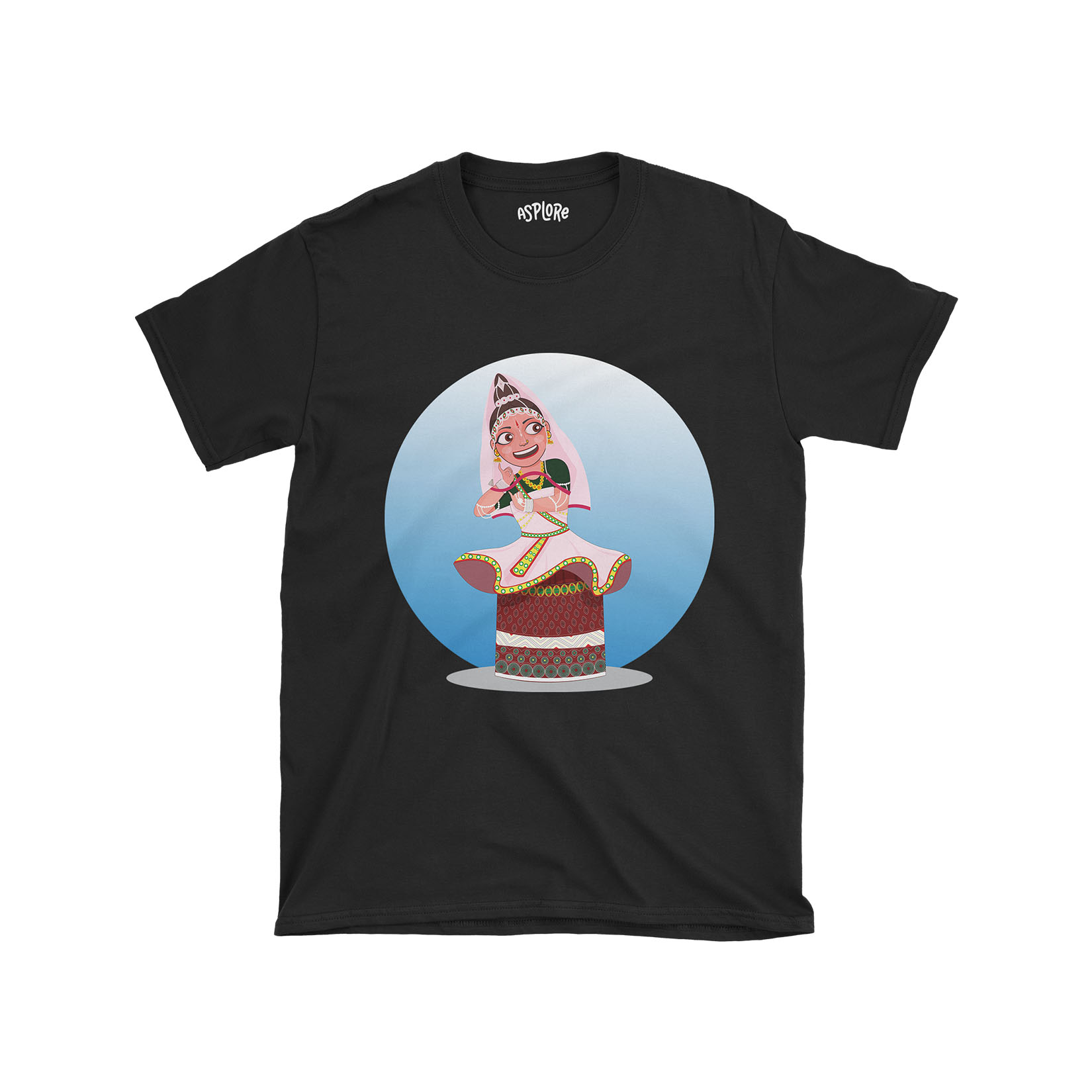 + Free ShippingManipuri Raas Leela, performed in the temples of Shree Govindjee in Imphal, is an expression of devotion and mythology that narrates the eternal love story of Lord Krishna and his beloved Radha. Declare your love for the beautiful heritage of Manipur with our cartoon artwork capturing the grace and beauty of a female Rasleela performer adorned in the exquisite potloi dress.